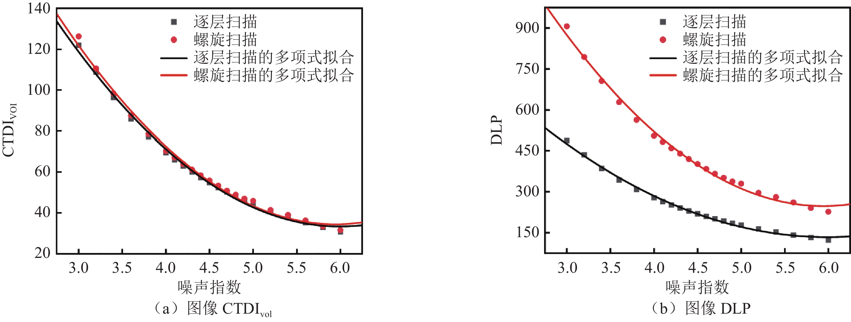 Objective: This study investigates the effects of different scanning modes and noise index (NI) on inner ear computed tomography (CT) image quality and radiation dose. Methods: (1) Head anthropomorphs phantoms were scanned using a 64-slice helical CT scanner. Both axial and helical scanning modes were employed, with each mode using progressively increasing NI values (3–6, totaling 21 values). In the helical mode, each NI value was used to reconstruct images in two modes: conventional helical reconstruction and helical reconstruction with spiral artifact correction (IQE). Three groups of images were obtained, each comprising 63 sequential images collected and reconstructed. Axial scanning was performed with a rotational speed of 1 second, a helical scanning pitch of 0.531:1, and a speed of 1 second, whereas the other scanning parameters remained constant. (2) Volume CT dose index (CTDIvol) and dose-length product (DLP) were recorded under different scanning conditions to analyze radiation dose. (3) Both objective and subjective image quality assessments were performed. Objective evaluations were conducted on three image groups, calculating the signal-to-noise ratio (SNR), contrast-to-noise ratio (CNR), and figure of merit (FOM) for the region of interest (ROI). Subjective evaluations included assessments of image edge contrast, image intensity, axial noise and artifacts, and multiplanar reconstruction (MPR) quality; a double-blinded method with a 5-point scale was used. The optimal NI value was determined based on the FOM values and subjective image quality assessments. Results: (1) In both axial and helical scanning modes, CTDIvol and DLP decreased as NI values increased. No significant difference was observed in CTDIvol (F=0.03, P > 0.05), but a significant difference was noted in DLP (F=19.78, P < 0.05). (2) Statistically significant differences were observed in soft tissue SNR, as well as SNR, CNR, and FOM for bone tissue, between axial and helical conventional modes and IQE mode (F=27.92, 20.14, 15.71,